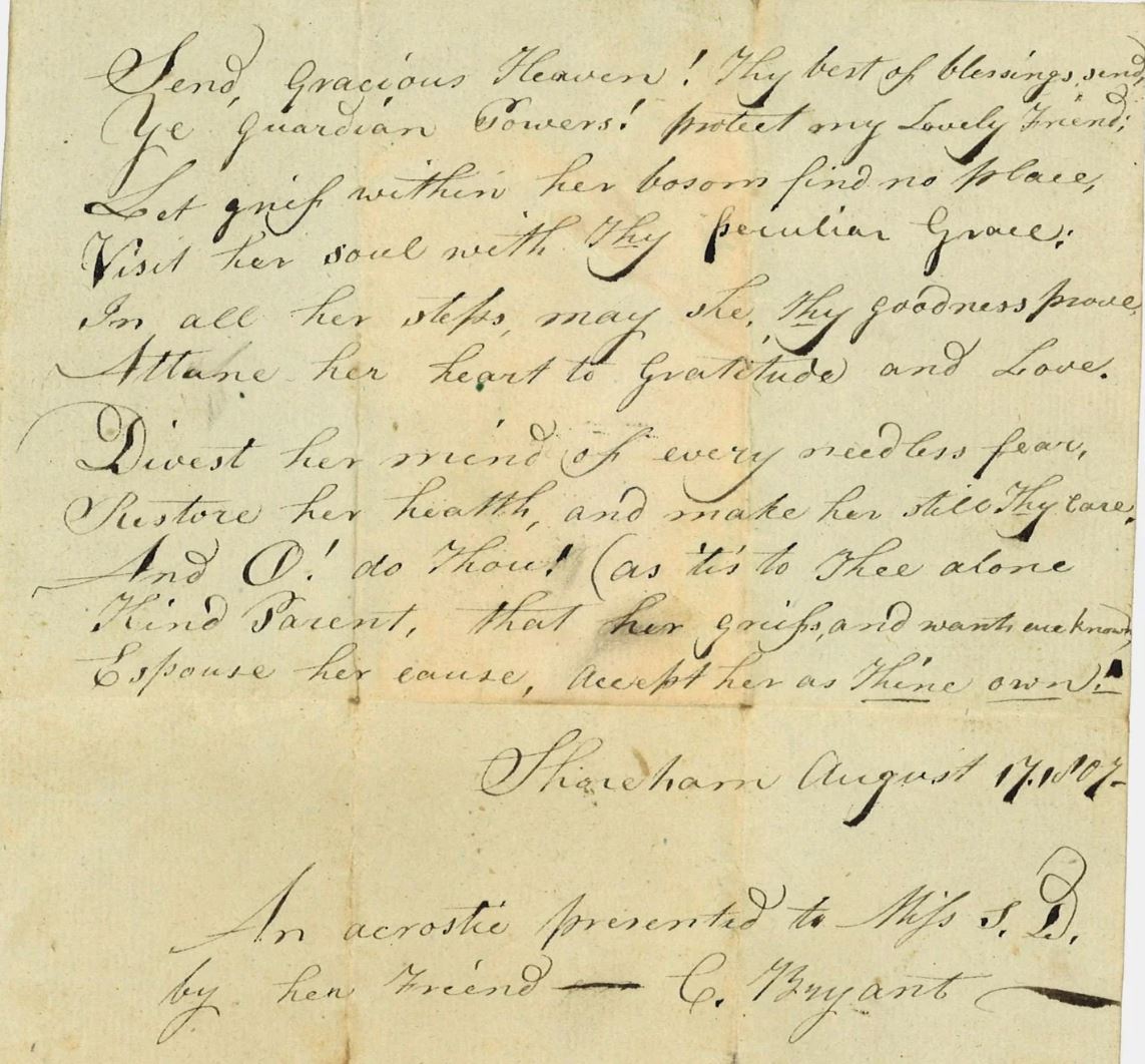 From 1799 to 1826, a time of great change in the newly formed United States of America, Lydia Richards (1782-1846) from Plainfield, Massachusetts, conducted a thirty year correspondence with her friend, Charity Bryant (1777–1851) from the Middlebury, Vermont area.