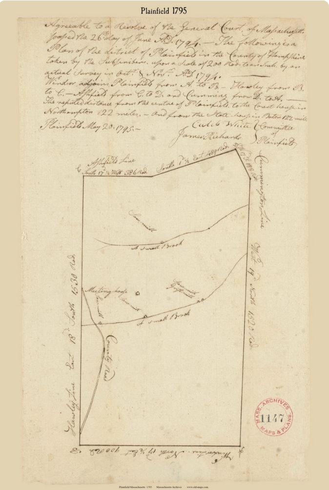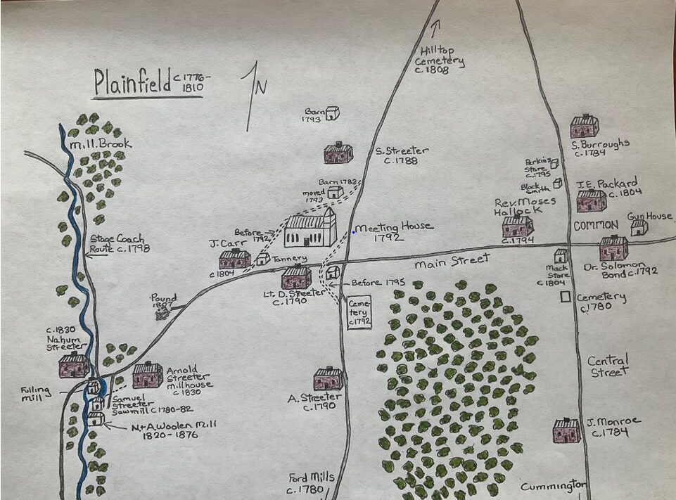The successive locations of Plainfield’s town meetings offer a clue to the evolution of the establishment of the town’s center. The first Plainfield town meeting in March of 1785 was at Simon Burroughs’s home, the next eight at Jonathan Monroe’s, all near the Upper Village. Their houses were some of Plainfield’s earliest and may have predated Samuel’s home by several years. Perhaps Burroughs envisioned his land as the future site for the meeting house as he was already hosting the militia on his property. In the past these preeminent structures had often been placed on town commons along with gun houses and militia grounds. Burroughs and Monroe lived on what is now known as Central Street, the main road south to the town of Cummington, and were undoubtedly interested in selling land and developing their end of the village. Perhaps Burroughs’s desire to sell smaller lots for more money, combined with the increased activity back down Main Street, made it predestined that by the fall of 1788, with a few exceptions, all future town meetings were held at Samuel Streeters. The meetings in 1788-1789 were held in his barn and by the following year moved to his “dwelling house,” indicating he had finished his house by the spring of 1790. Although the location of the meeting house had not been discussed at town meeting from 1789-1790, it seems that a consensus in favor of Samuel’s land had been arrived at over this time. At the meeting in May 1791, citizens voted first that all future town and sabbath meetings that year be at Samuel’s house, and then voted to build a meeting house 55-1/2 ft. by 42-1/2 ft. on Samuel Streeter’s land. There were 67 yeas and 4 nays, indicating over 70 families now called Plainfield home, well above the 60 necessary for town status. The meeting house lot was described as being west of the road leading from Samuel’s house down to the Ford brothers “corn mill,” as well as south of the road leading from Samuel’s house to his mill. 12