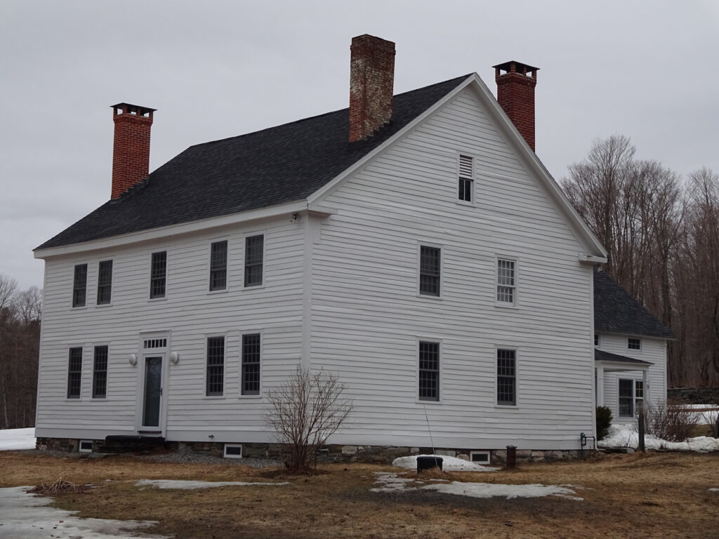 About 1830 Samuel and Bathsheba sold their home to lawyer Cyrus Joy, who doubled its size by lifting it up and putting in a new story underneath. With the added four chimneys, it became a “modern” two story colonial and all but unrecognizable. The old couple may have then moved down the hill to Arnold’s house to live out their days surrounded by his and Nahum’s families. Perhaps it was a good thing they did not live long enough to see their venerable meeting house taken down in 1845. Much debated, this decision was opposed by a minority in the town who thought it would have been cheaper to remodel the building and reuse its heavier and sturdier frame. Despite this, the town replaced the old fashioned meeting house with an architecturally harmonious, side by side Greek Revival church and town hall which continue to define the center of Plainfield to this day. These separate buildings were mandated by the state amendment of 1833 that divided church and state and were erected in 1846 and 1847. By then religious practice and architectural styles had definitely changed.